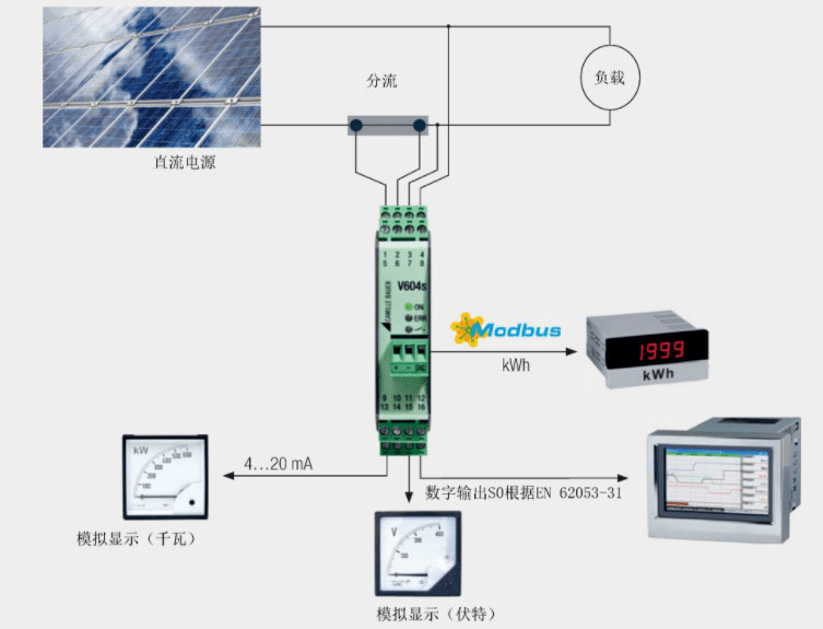 來自Camiller Bauer的直流電量變送器Sineax V604s,配套DC分流器,可用于監(jiān)測離網式光伏供電系統(tǒng)太陽能電池板的實時功率。